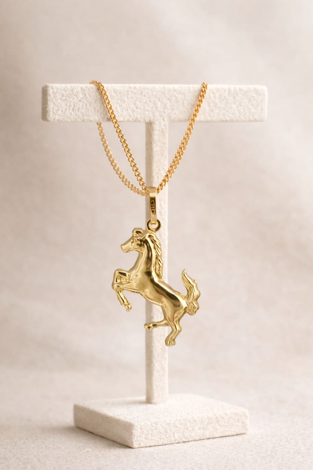 Designed as a detailed rearing stallion, this refined gold horse necklace customers love captures movement, power and timeless equestrian style.